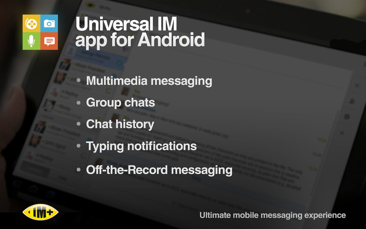We figured you've been looking for a free alternative to SMS for a while now. And now we've got that right in IM+ Pro. Available for Android smartphones/tablets and other mobile devices that your friends use IM+ on: iPhone, iPod Touch, iPad, BlackBerry and Windows Phone.